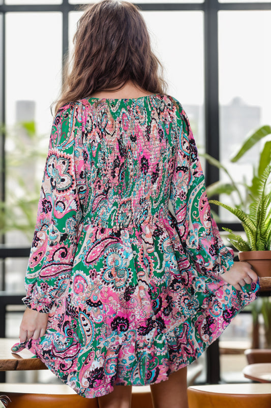 Printed V-Neck Long Sleeve Mini Dress